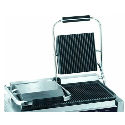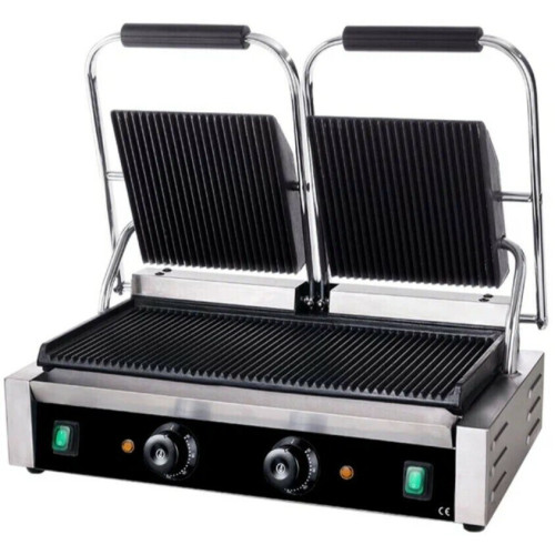 Гриль контактный Viatto GH-813EH электрический. Две прижимные рифленые поверхности с антипригарным покрытием. Размер нижних поверхностей 360х240мм, верхних - 340х220мм. 2 зоны нагрева (2 терморегулятора), защита от перегрева, 4.4 кВт, 220В. Используется в ресторанах, кафе, заведениях быстрого питания для обжаривания мяса, рыбы и овощей, приготовления различных сэндвичей.