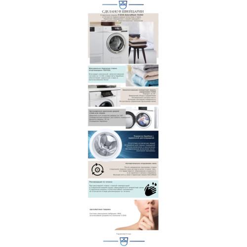 Деликатная стирка одежды, барабан имеет 14 000 отверстий диаметром всего 2 мм - лучший показатель качества стирки Индивидуальная настройка программ Дисплей на 9 языках Premium Swiss Quality — инновации разработчиков V-ZUG Мои программы— можно сохранить до 6 любимых программ Автоматическая экономия воды и энергии при частичной загрузке Возможность перенавесить дверь на правую сторону - опция за доп.плату Система поглощения вибраций VAS: ? Тихий режим работы с малой вибрацией при стирке и отжиме ? Уменьшенная продолжительность программ ? После стирки вещи становятся более сухими ? Повышенная частота вращения при отжиме без прерывания работы ? Увеличенный срок службы машины