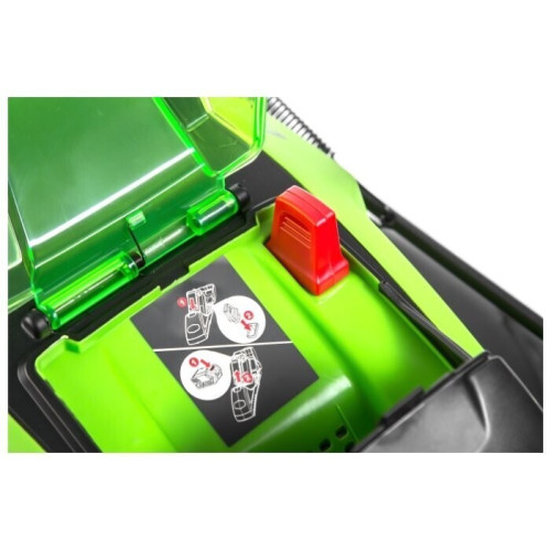 колесная газонокосилка электрический двигатель от аккумулятора (40 В / 3 А·ч) ширина / высота скашивания: 45 см / 20-70 мм выброс травы в мягкий травосборник , вбок, назад мульчирование