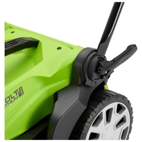 колесная газонокосилка электрический двигатель от аккумулятора (40 В / 4 А·ч) ширина / высота скашивания: 35 см / 32-85 мм выброс травы в мягкий травосборник , назад мульчирование вес: 14.5 кг уровень шума 93 дБ