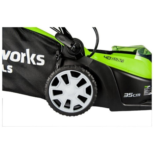 колесная газонокосилка электрический двигатель от аккумулятора (40 В / 6 А·ч) ширина / высота скашивания: 35 см / 32-85 мм выброс травы в мягкий травосборник , назад мульчирование вес: 14.5 кг уровень шума 93 дБ