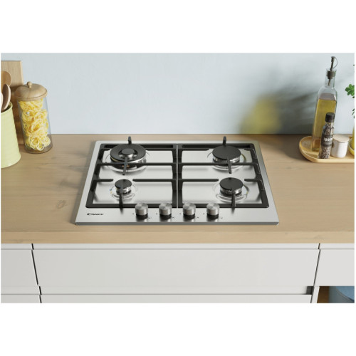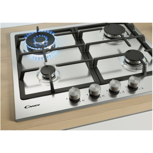 Газовая варочная поверхность 60 см. Цвет: Нержавеющая сталь. Ручки: Timeless. Газ-контроль. Автоматический электроподжиг. 4 конфорки: двойная корона 4 кВт (Wok), быстрая 2,5 кВт, полубыстрая 1,75 кВт и вспомогательная 1 кВт. 2 чугунные решетки. Цельноштампованная поверхность. Комплект форсунорк для балонного газа. Мощность 9,25 кВт.