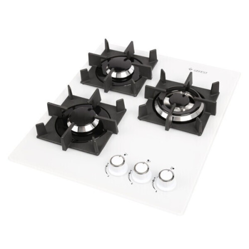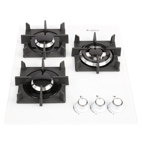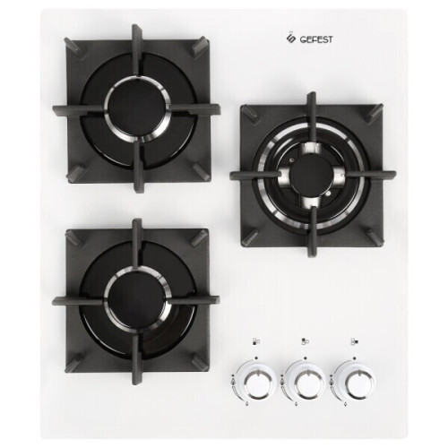 Газовая варочная поверхность GEFEST имеет компактные размеры, а значит, подходит для оснащения маленьких кухонь . На стеклянной панели белого цвета располагаются всего 3 конфорки, закрытые чугунными решетками. Одна из конфорок имеет двойной ряд пламени («Двойная корона»), что делает ее более мощной. На ней можно быстро приготовить или разогреть большую порцию еды. Для безопасной эксплуатации варочная поверхность оснащена опцией газ-контроля, способной автоматически прекращать подачу газа в конфорку с погасшим пламенем. Для включения конфорок и регулировки пламени в них газовая варочная поверхность оборудована поворотными переключателями, которые четко фиксируются в нужном положении. В каждый из них встроен механизм электроподжига, благодаря чему зажигать пламя в конфорке можно без использования спичек. Для работы данного механизма варочная поверхность подключается к электросети с помощью кабеля (в комплекте). Специальная конструкция форсунок варочной поверхности предусматривает использование природного газа (метана) и сжиженного (пропана-бутана).