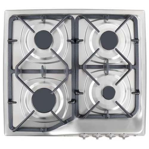 Газовая варочная панель с поверхностью из нержавеющей стали, с вынесенной вперед панелью управления. Четыре конфорки: две стандартные дополнены одной мощной, быстрого нагрева и маленькой, экономичной для посуды небольшого диаметра. Ручка управления газовой конфорки плавно регулирует мощность горения, предусмотрено положение