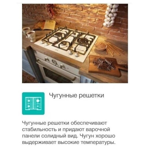 Тип: газовая; Всего конфорок: 4; Установка: независимая; Конфорок индукционных: 0; Материал панели: эмаль; Цвет: слоновая кость; Расположение панели управления: спереди; Переключатели: поворотные; Газ-контроль конфорок: есть; Распознование наличие посуды: нет; Распознавание размера посуды: нет; Индикатор остаточного тепла: нет; Таймер конфорок: нет; Электроподжиг: есть; Тип электроподжига: автоматический; Дополнительные возможности: электроподжиг, чугунные решетки; Описание: Конфорка вок с особым расположением форсунок направляет пламя просто на сковороду вок и обеспечивает еще больше нагрев. Блюда азиатской кухни, овощи и другая еда еще никогда не выходили такими хрустящими и вкусными – и, к тому же, так быстро. Автоматический электроподжиг — еще одно преимущество, обеспечивающее дополнительное удобство и легкое управление. Чтобы разжечь газовую горелку, просто нажмите на ручку необходимой конфорки и установите мощность работы. Быстро, просто, и вам не понадобятся спички!; Ширина: 60; Ширина встраивания: 56 см; Глубина: 52; Глубина встраивания: 49 см; Высота: 13; Высота: 13