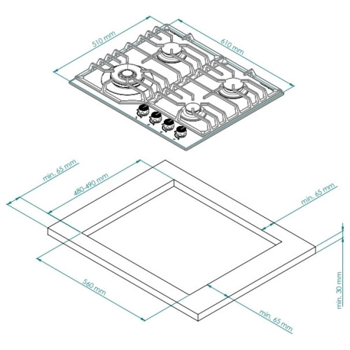 тип панели: газовая, количество конфорок: 4, материал панели: закаленное стекло, установка: независимая, переключатели: поворотные, ширина: 61 см, глубина: 51 см, специальные конфорки: Двойная корона, газ-контроль конфорок, максимальная потребляемая мощность: 8.80 кВт