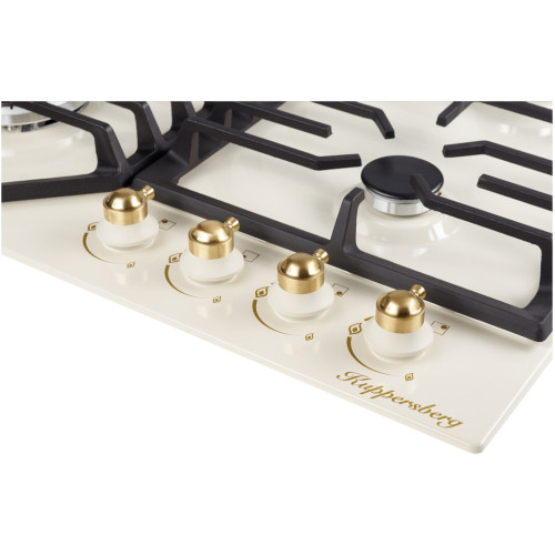 Газовая встраиваемая варочная панель FS 601 C Bronze бежевого оттенка с бронзовой фурнитурой изготовлена из прочной многослойной эмали и дополнена чугунными решетками, а значит, отличается практичностью. Не помешает оценить ряд важных характеристик данной модели: - 4 конфорки проверенного бренда Sabaf; - одна из горелок отличается повышенной мощностью и подходит для WOK-посуды; - встроенный электроподжиг; - режим контроля подачи газа. Немецкий производитель KUPPERSBERG дает гарантию долгой и безупречной работы прибора. КОНФОРКИ SABAF В наших варочных панелях установлены конфорки Sabaf. Sabaf это - ведущий мировой производитель газовых конфорок. Многолетний опыт и технологии, обеспечивают гарантию безопасности и долговечности использования. АНГЛИЙСКОЕ Варочные поверхности покрытые эмалью имеют глубину цвета, а также приятные и гладкие на ощупь. Современные технологии эмали позволяют создать материал стойкий к нагреву и устойчивый к износу и по этим причинам эмалированные варочные поверхности Kuppersberg, не только красивы, но и практичны в применении и уходе. ЧУГУННАЯ РЕШЕТКА Решетка изготовлена из чугуна с оригинальным дизайном и практичной формой. Фиксацию решетки на варочной панели обеспечивает ребро жесткости, за счет специальных креплений.