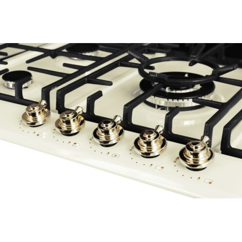 Газовая варочная панель Kuppersberg FV9TGRZ C Gold с эмалированной поверхностью бежевого цвета легко управляется посредством эстетичных поворотных переключателей цвета золота. Конструкция предусматривает 5 конфорок, одна из которых WOK повышенной мощности. В целях комфортной и безопасной эксплуатации имеются автоматический электроподжиг и система по контролю утечки газа.