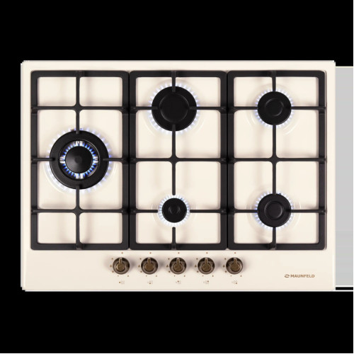 Описание Maunfeld EGHE.75.33CBG1.R/G — это газовая варочная панель шириной 70 см и 5 итальянскими конфорками «SABAF». Управление механическое, осуществляется при помощи цельнометаллических поворотных ручек серебристого цвета. Решётки чугунные. Функция газ-контроля обеспечивает безопасную эксплуатацию. Ключевые преимущества: * Чугунные решётки * WOK-горелка * Электроподжиг ОСНОВНЫЕ ХАРАКТЕРИСТИКИ Тип поверхности \t газовая Количество конфорок \t 5 Высота, см \t 5.1 Ширина, см \t 70 Глубина, см \t 51.5 Габариты ниши для встраивания (Ш х Г), см \t 56 х 48.5 ДИЗАЙН И УПРАВЛЕНИЕ Дизайн (коллекция) \t Retro Цвет \t слоновая кость Цвет фурнитуры \t бронзовый Материал поверхности \t металл с эмалью Решетки \t чугунные Тип управления \t механическое Элементы управления \t поворотные Особенности элементов управления \t цельнометаллические полнотелые ручки Итальянские горелки SABAF \t Да РЕЖИМЫ И ФУНКЦИИ Электроподжиг \t автоматический КОНФОРКИ Газовых конфорок / горелок \t 5 WOK-конфорок \t 1 Тройное кольцо пламени Triple Ring Burner \t Да МОЩНОСТЬ КОНФОРОК Мощность левой конфорки, Вт \t 3800 Мощность передней правой конфорки, Вт \t 1700 Мощность передней центральной конфорки, Вт \t 1000 Мощность задней центральной конфорки, Вт \t 2600 Мощность задней правой конфорки, Вт \t 1700 ФУНКЦИИ БЕЗОПАСНОСТИ Газ-контроль \t Да ТЕХНИЧЕСКИЕ ХАРАКТЕРИСТИКИ Максимальная потребляемая мощность газовых конфорок, Вт \t 10800 Напряжение, В \t 220-240 Частота, Гц \t 50-60 Использование газа \t баллонный газ (тип G30), магистральный