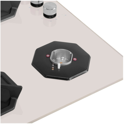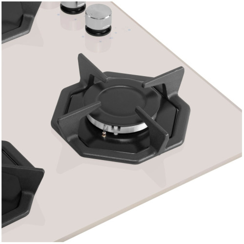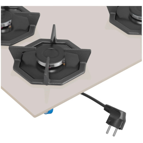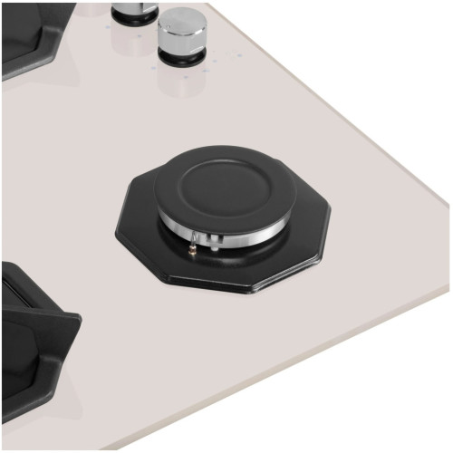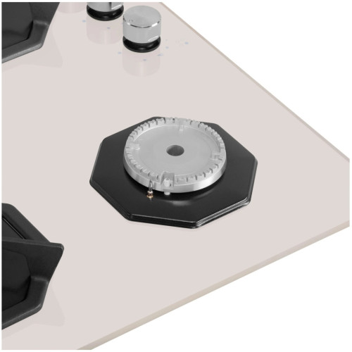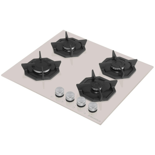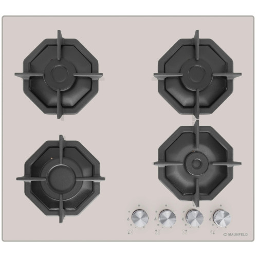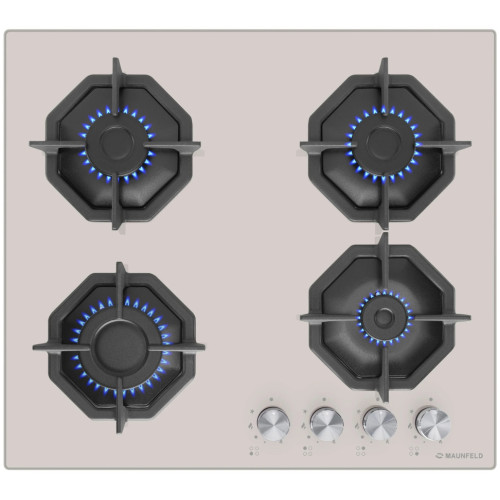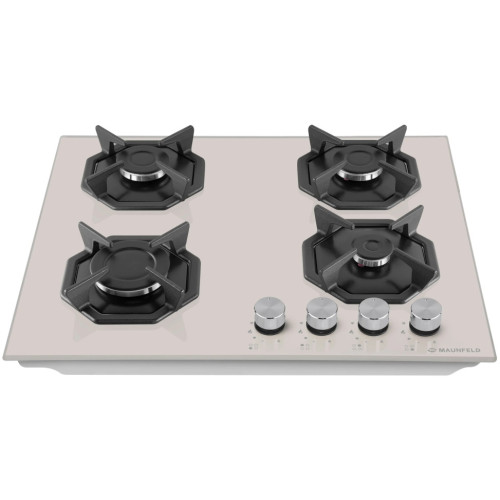 Дизайнерская встраиваемая газовая варочная панель шириной 60 см может работать от магистрального газа и газа в баллоне (тип G30), для этого достаточно поставить специальные жиклеры французской фирмы SOURDILLON, находящиеся в комплекте. Панель выполнена из закаленного стекла бежевого цвета. В данной модели установлены высококачественные итальянские горелки SABAF. Четыре стандартные конфорки мощностью 1000 Вт, 1700 Вт, 1700 Вт и 2600 Вт. Регулирование подачи газа и электроподжиг конфорок происходит с помощью поворотных регуляторов - полнотелых цельнометаллических ручек. Для простоты использования около каждой ручки нанесены информационные изображения: используемая конфорка, подача газа выключена, электроподжиг, максимальное пламя и минимальное пламя. Восьмиугольные чугунные подставки – это запатентованное изобретение MAUNFELD, прочные и долговечные. Сами конфорки спроектированы таким образом, что огонь не перегревает ни чугунные решетки, ни ручки управления. Система газ-контроля надежно защищает бытовой прибор от утечек газа при неожиданном затухании конфорки.