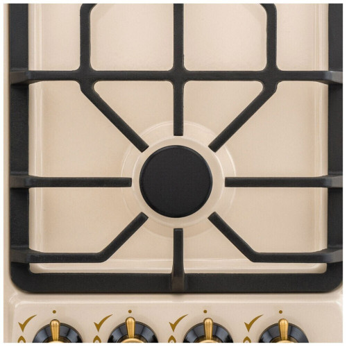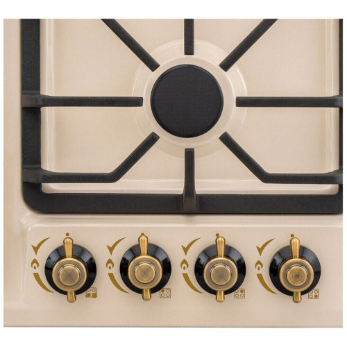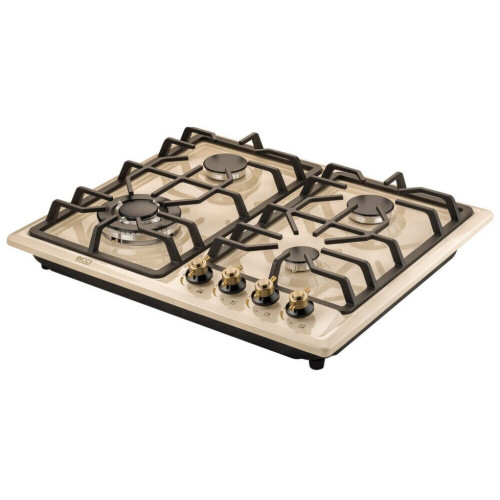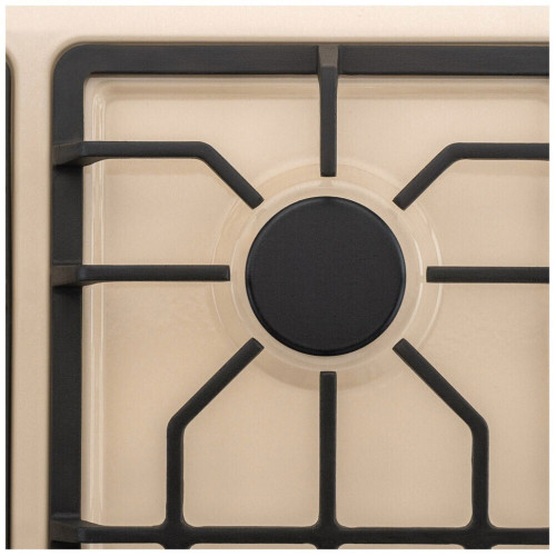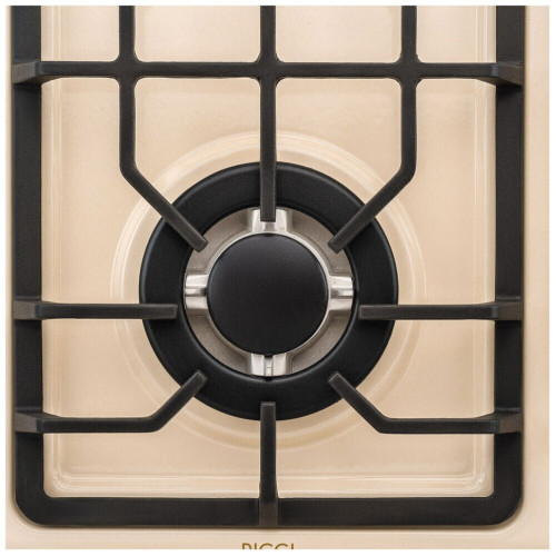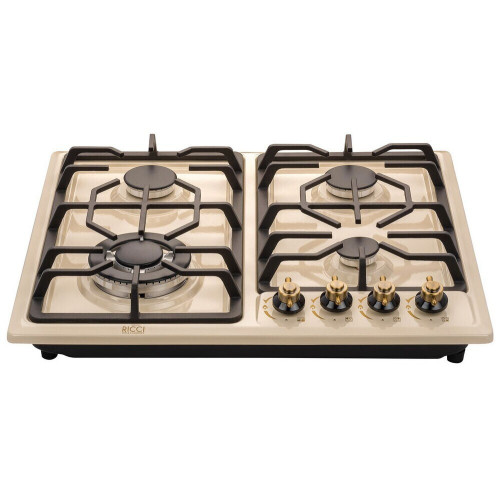 Встраиваемая газовая варочная панель Ricci HBS4513RD с рабочей поверхностью из эмали выполнена в приятном бежевом цвете, стоит также отметить интересный дизайн поворотных переключателей на лицевой панели. Данная модель оснащена конфоркой быстрого нагрева (WOK) и усиленной чугунной решеткой.
