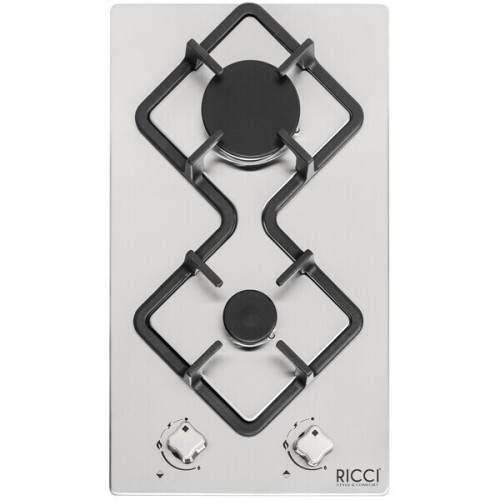 Газовая варочная панель Ricci RGN-KA2001 выполнена в дизайне «Домино»: её ширина всего 29 см. Это подходящий вариант для маленьких кухонь, для тех, кому не нужно готовить в больших объёмах, и для создания индивидуальных комбинаций: например, если вы решите сочетать две поверхности и добавить к обычным конфоркам ещё и вок. Расположение двух зон нагрева очень удобно. На передней можно использовать посуду небольшого диаметра, чтобы быстро сварить кофе или разогреть одну-две порции супа в маленьком ковшике. Задняя, более мощная, нагреет большую кастрюлю. Любите блюда, требующие длительного приготовления на небольшом огне? Вам поможет функция «Малое пламя», которая предотвратит его затухание. Поверхность выполнена из закалённого стекла. Благодаря своей гладкости этот материал легко очищается. Решётки сделаны из чугуна, он устойчив к воздействию высоких температур и не прогнётся от веса кухонной утвари. Встроенный электроподжиг избавит вас от необходимости покупать спички и зажигалки. За безопасность отвечает система «Газ-контроль», которая предотвратит утечку, если огонь по каким-то причинам погаснет.