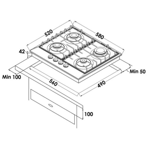 Газовая варочная поверхность SLIM Line, Металл, Ширина 60 см, Лицевая толщина панели - 3,8 мм , 4 конфорки : 1 WOK конфорка (3600 Вт), 2 стандартные конфорки (1750 Вт), 1 экономичная конфорка (1000 Вт), Автоподжиг, Газ-контроль, составные чугунные решётки, Жиклёры для баллонного газа, Материал панели управления: Нержавеющая сталь, Цвет переключателей: нержавеющая стальВхШхГ), мм: 100x580x510