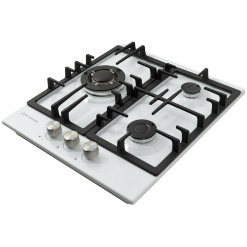 Газовая варочная поверхность металл, Ширина 45 см, 3 газовые конфорки, 1 экономичная конфорка (0,9 кВт), 1 стандартная конфорка (1,7 кВт), 1 ВОК конфорка(3,5 кВт), Автоподжиг, Чугунные решетки, Жиклёры для баллонного газа, Газ-контроль, Цвет: белый