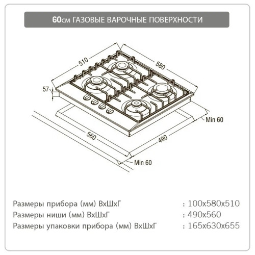 материал панели: нержавеющая сталь/эмаль количество конфорок: 4 установка: независимая электроподжиг: есть газ-контроль: есть чугунные решетки: есть переключатели: поворотные ШхГ: 58.40х51 см