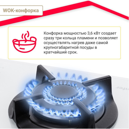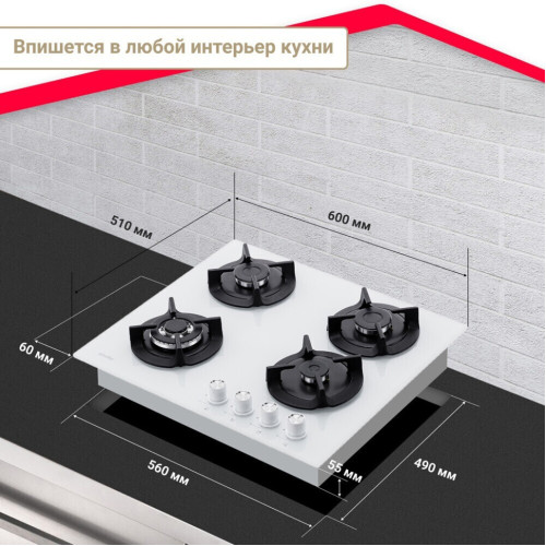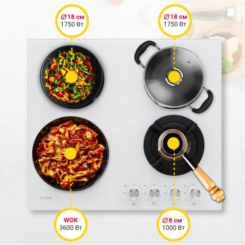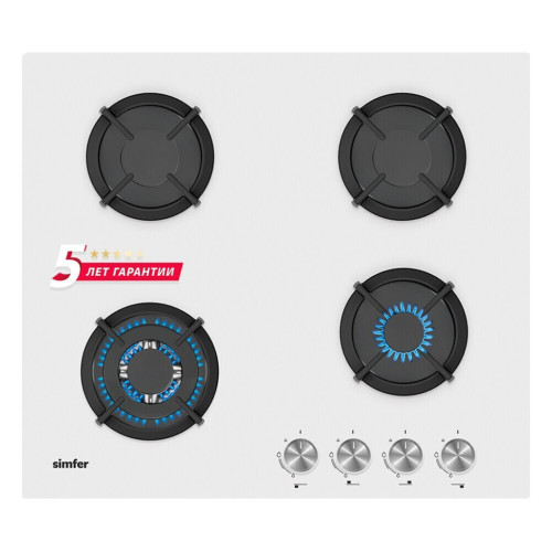 Газовая варочная панель Simfer H60N41W571 - модель, которая благодаря своим компактным размерам органично впишется в интерьер вашей кухни и сделает ежедневный процесс приготовления еды комфортным. В качестве материала для изготовления варочной поверхности использовалось закаленное стекло, которое в разы упрощает утомительный процесс ухода за ним и делает процесс очистки лёгким и удобным. На ней располагаются четыре конфорки - разные по диаметру и мощности пламени в них. Одна из конфорок имеет повышенную мощность до 3600 Вт (WOK-конфорка). А значит вы сможете выбрать оптимальную конфорку для приготовления разнообразных блюд. В поворотные переключатели встроен электроподжиг, который значительно упрощает работу с панелью, а система газ-контроля предотвращает возможность случайной утечки газа в случае угасания пламени. Модель снабжена газ-контролем.