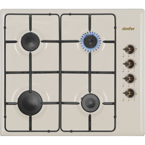 Газовая варочная поверхность Simfer H60Q40O411 выполнена из эмалированной стали. Поворотные переключатели с бронзовой отделкой смотрятся очень стильно на фоне бежевого цвета корпуса панели. Модель имеет 4 конфорки, одна из которых повышенной мощности. Так же поверхность снабжена автоматическим электроподжигом и защитой от утечки газа при внезапном угасании пламени.