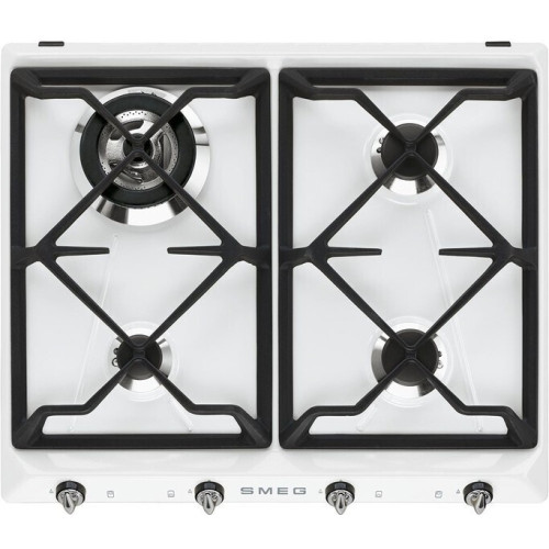 Smeg SR964BGH — газовая варочная панель шириной 60 см. Модель оборудована оригинальными поворотными переключателями с эффектом нержавеющей стали и высокопрочными чугунными решетками. Надежная система контроля пламени исключает возможность топливной утечки. Ключевые преимущества: * Автоматический электроподжиг * Газ-контроль * Чугунные решетки