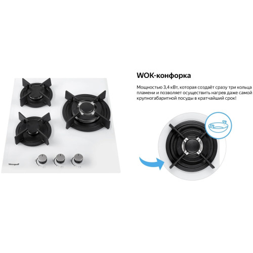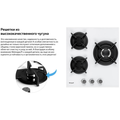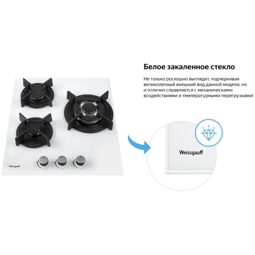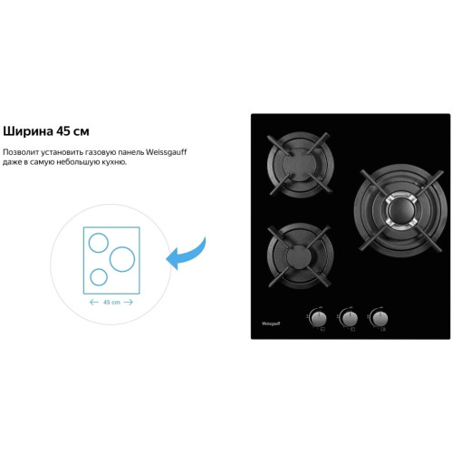 Встраиваемая независимая газовая панель Weissgauff шириной 45 см, исполненная в закалённом белом стекле - это стильное и компактное решение для вашей кухни! Ширина 45 см позволит установить газовую панель Weissgauff даже в самую небольшую кухню! Белое закаленное стекло не только роскошно выглядит, подчеркивая великолепный внешний вид данной модели, но и отлично справляется с механическими воздействиями и температурными перегрузками! Решетки из высококачественного чугуна это неизменное качество, надежность и долговечность, воплощенные в каждой детали! А особая элегантность их дизайна не только послужит отличным дополнением к общему стилю варочной панели, но и существенно облегчит очистку и уход за ней. А благодаря особому вниманию Weissgauff к каждой детали, вы еще не раз оцените устойчивость и эргономичность этих решеток! WOK-конфорка мощностью 3,4 кВт, которая создаёт сразу три кольца пламени и позволяет осуществить нагрев даже самой крупногабаритной посуды в кратчайший срок! Газ-контроль каждой конфорки обеспечивает наивысшую безопасность: в случае, если пламя погасло, подача газа будет автоматически прекращена! Рукоятки Hi-Tech дополняют современный, по-немецки выверенный облик модели. Более того, конструктивные особенности строения и расположения этих рукояток защищают их от перегрева и деформации при длительном термическом воздействии в процессе приготовления еды! Автоматический электроподжиг, независимо встроенный в каждую из рукояток, позволит зажечь любую конфорку за долю секунды, всего одним нажатием и поворотом руки, не прибегая к дополнительным приспособлениям!