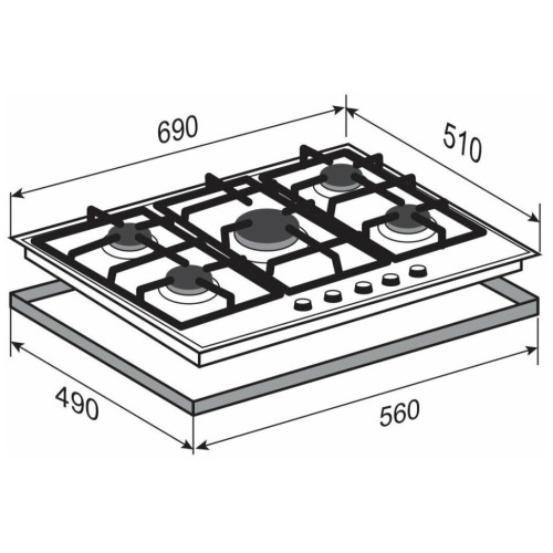 тип панели: газовая, количество конфорок: 5, материал панели: нержавеющая сталь, установка: независимая, переключатели: поворотные, ширина: 69 см, глубина: 51 см, газ-контроль конфорок, максимальная потребляемая мощность: 3.80 кВт