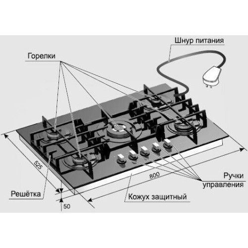 | Дополнительная информация | защитное отключение конфорок, индикатор остаточного тепла, кнопка блокировки панели |