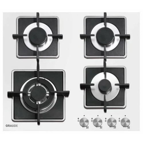 Независимая газовая варочная поверхность в белом цвете с поверхностью выполненной из закаленного стекла, электроподжигом и газ-контролем. Модель включает 4 конфорки, одна из которых с тройной "короной" и поворотные переключатели.