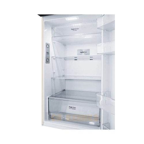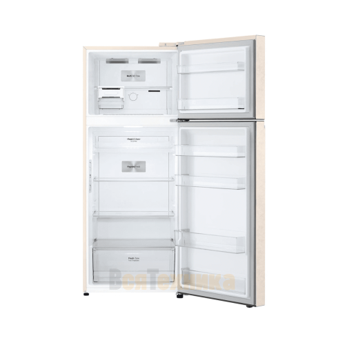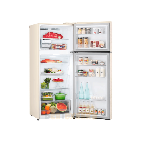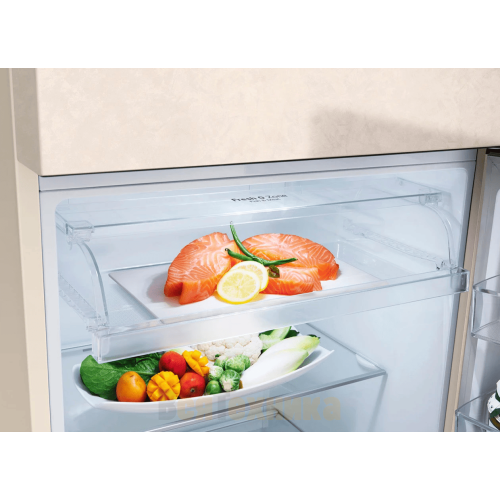 - Зона свежести Door Cooling+: Специальные воздуховоды в дверце создают поток холодного воздуха, который опускается вниз, обеспечивая равномерное охлаждение на всех полках, включая самые нижние. Это особенно важно для скоропортящихся продуктов.