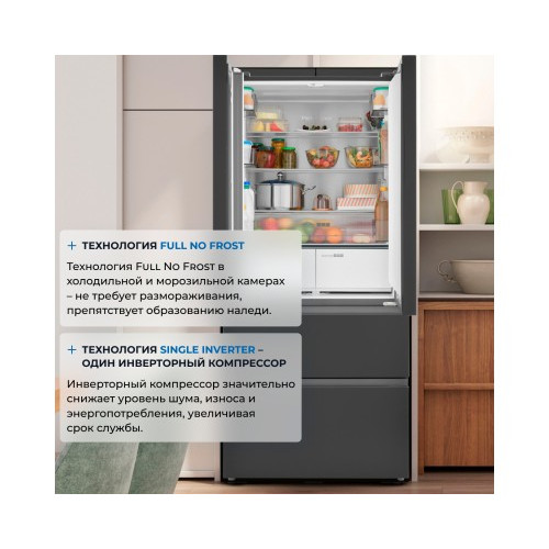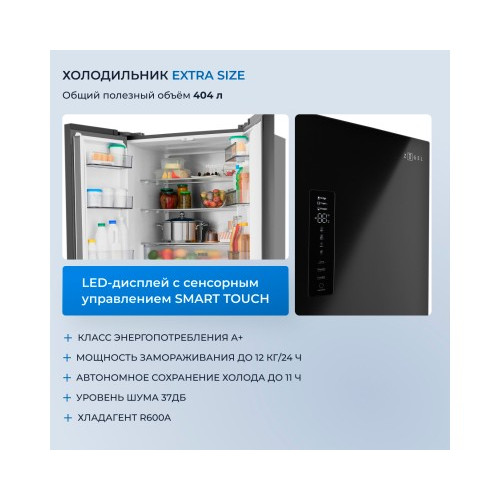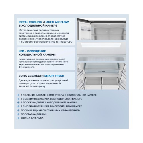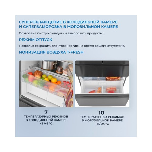 | Дополнительные особенности | Зона свежести Smart Fresh с регулировкой температуры от -3 до 4°С/Особая конструкция и теплоотвод позволяют встроить прибор в нишу/Полки и ящики со стальным обрамлением/Предупреждение о повышении температуры в морозильной камере/Регулятор уровня влажности Humidity Control в выдвижном ящике |