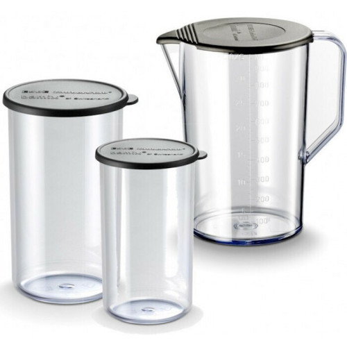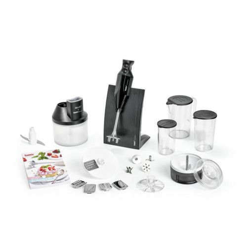 Блендер Bamix Baking M200 представлен в черном корпусе из нейлона и дополнен долговечными металлическими ножами, погружная часть выполнена из оцинкованной латуни. Такая конструкция позволяет взбивать, перемешивать и даже колоть лед. Устройство оснащено двумя скоростями, развивающимися в пределах 12000-17000 об/мин. Погружной блендер Bamix Baking M200 действует с мощностью 200 Вт, подключаясь к розетке с помощью 1.9-метрового кабеля. Поставка осуществляется с литровым кувшином с ручкой и двумя стаканами 400мл и 600 мл, устойчивой подставкой-держателем, комбайном-измельчителем и набором различных насадок: многофункциональная, 3 терки, 2 шинковки, перемешивания и рубки мяса. Блендер весит 0.94 кг.