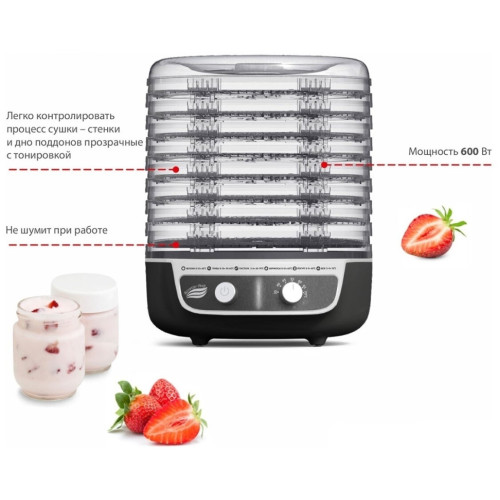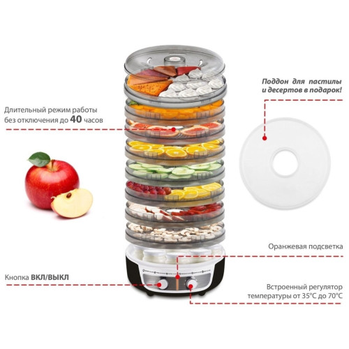 Сушка «Великие Реки Волга-9» будет особенно полезна тем, кто делает сезонные заготовки. В ней можно перерабатывать фрукты, ягоды, овощи, зелень и травы, грибы, а также сушить хлеб и вялить мясо и рыбу. Подойдёт она и для приготовления некоторых десертов, например, безе и йогурта. К вашим услугам восемь поддонов диаметром 33 см, выполненных из прозрачного пластика, что позволит легко контролировать процесс. Вы получите возможность за раз загружать большие порции и припасы разных типов. Встроенный вентилятор равномерно распределяет тёплый воздух и обеспечивает его циркуляцию. Механическая панель управления не доставит сложностей в освоении. За включение и выключение отвечает кнопка, за установку температуры в диапазоне от 35 до 70° – поворотный регулятор. В прилагаемой инструкции