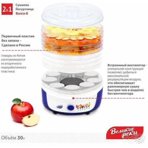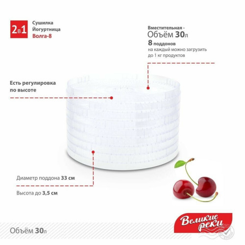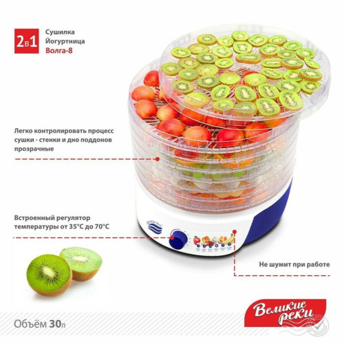 Мощность 500 Вт, 8 поддонов (2 из которых со съемной сеткой), что дает возможность устанавливать емкости для приготовления йогурта, 2 рабочих объема - 23 л и 30 л. Выбор нужной температуры сушки от 35 до 70 градусов. Встроенный вентилятор. 2 года гарантии. Книга рецептов. Цветная коробка. Сушилка сделана из первичного пищевого пластика, не шумит. Терморегулятор. Позволяет сушить фрукты, овощи, грибы, травы. Функция приготовления йогурта. Ёмкости для йогурта в комплект не входят. Сушка овощей, фруктов, грибов сохраняет все витамины и полезные микроэлементы.