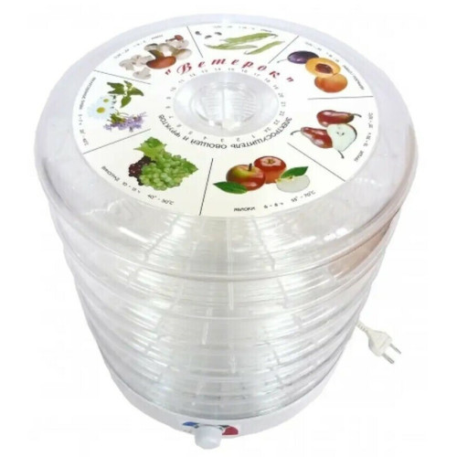 Сушилка для овощей и фруктов или дегидратор Ветерок-5 (кол-во сит-5), Сушилка конвекционная, прозрачная, 500 Вт, температурный режим от 30С до 70С, Номинальная потребляемая мощность 0,5 кВт. Номинальное напряжение 220 В. Класс защиты от поражений электрическим током. Количество нагревателей 1 шт. Номинальная нагрузка на одном поддоне 1 кг. Температура воздуха на нижнем поддоне электросушителя 55-70 градусов. Длина электрического шнура, не менее 1500 мм. Габаритные размеры 325 х 400. Масса брутто, не более 3,9 кг. Упаковка цветной короб. Срок службы не менее 10 лет.