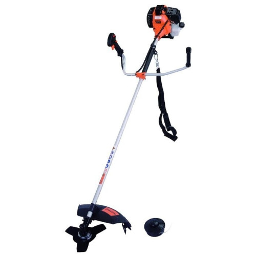 тип триммера: переносной мощность ДВС 1.75 л.с. двухтактный двигатель емкость топливного бака 0.7 л ширина скашивания 25 см режущий элемент триммера: леска и нож конструкция штанги: прямая форма рукояти: Т-образная (велосипедная) плечевой ремень наличие колес: нет вес 7 кг