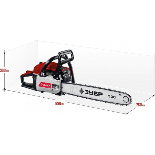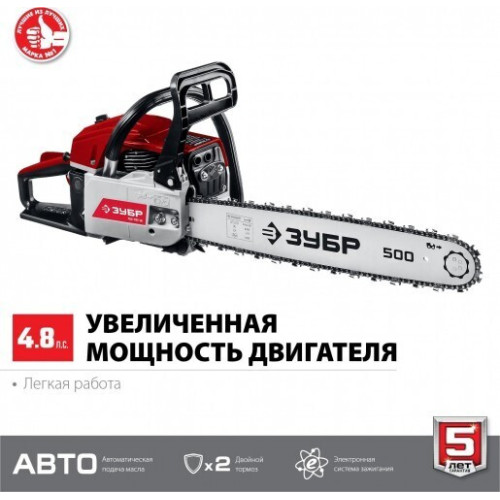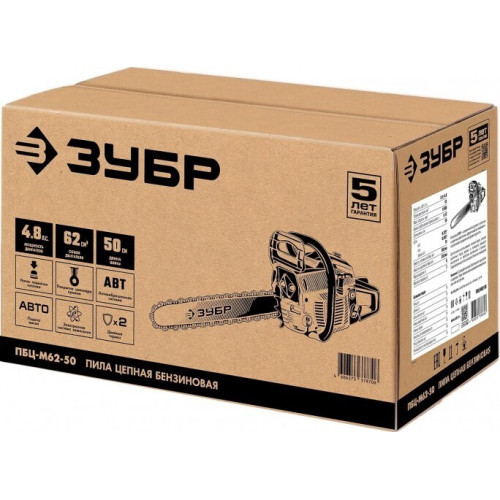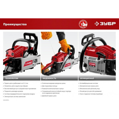 Идеальный вариант для пиления досок, бруса, стволов различных пород дерева на дачном участке. В отличие от электрической, бензиновая пила оснащена более мощным двигателем, безопасна в отношении поражения электрическим током, может работать в любую погоду и в любом месте. Функции легкого запуска, автоматической смазки цепи и эффективная антивибрационная защита делают пилу легкой в обращении и комфортной в работе. Двойной тормоз цепи, приводимый в действие при откидывании защитного щитка или при отпускании клавиши блокировки на рукоятке, а также встроенный цепеуловитель и металлический упор делают пилу безопасной в применении. Большая удельная мощность, высокое качество применяемых материалов и изготовления, обеспечивающие увеличенный ресурс, делают бензиновую пилу ЗУБР Вашим лучшим помощником. Преимущества * * Повышенная мощность при компактных размерах * Насос подкачки топлива способствует более легкому запуску, даже в холодную погоду * Продуманная виброгасительная система, очень эффективна при длительном пилении * Электронная система зажигания обеспечивает ровную, экономичную и экологичную работу двигателя * Насос принудительной подачи смазки к цепи уменьшает износ, что увеличивает срок службы цепи и шины * Тормоз мгновенного действия обеспечивает высокую безопасность работ, мгновенно останавливая пильную цепь в случае опасности * Система предварительной очистки воздуха удаляет из входного воздуха наиболее крупные частицы и увеличивает срок службы фильтра * Удобная эргономичная рукоятка * Емкость для смешивания в комплекте