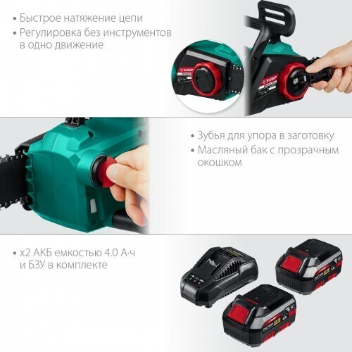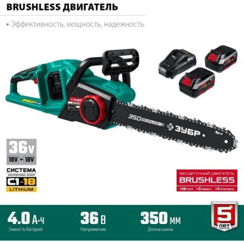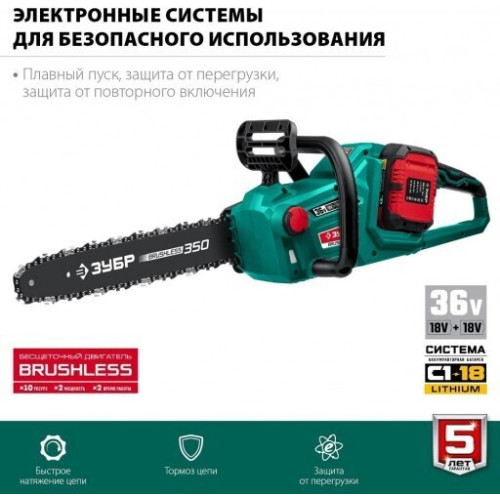Преимущества: * Единая аккумуляторная система С1-18В для множества инструментов * Удобное средство для обрезки и пиления веток и деревьев * Прекрасная альтернатива бензиновой и электрической пилам: отсутствие необходимости постоянной покупки ГСМ и контроля уровня топлива, нет опасности повредить провод и проблем с ограничением его длины, простота эксплуатации и ремонта, меньшие шум и вибрация и полное отсутствие вредных выбросов * Мощный двигатель напряжением 36 В ускоряет процесс пиления, а шина длиной 350 мм позволяет справляться с большинством веток * Бесщеточный двигатель Brushless обладает целым рядом преимуществ по сравнению с обычным щеточным двигателем: - высокий крутящий момент – в 2 раза выше, чем у аналогичного щеточного двигателя, - высокий КПД благодаря максимально эффективному преобразованию электромагнитной энергии в механическую (ввиду отсутствия перекоммутаций), * - низкое энергопотребление, вследствие чего изделие работает до 4 раз дольше на одном заряде батареи, - высокая степень защиты двигателя благодаря интеллектуальному управлению, * - контроллер двигателя позволяет гибко регулировать крутящий момент и поддерживать его на максимальном уровне в широком диапазоне оборотов, - отсутствие постоянных перекоммутаций в коллекторе и, соответственно, отсутствие нагрева и потерь из-за переходных сопротивлений, - повышенная надежность ввиду отсутствия искрения, трения и контактирующих деталей * Аккумуляторная система С1-18В для большей эффективности: - увеличенная на 50% производительности, - отсутствие эффекта памяти, - отсутствие потери мощности в процессе работы * Быстрозарядное интеллектуальное устройство: - заряжает импульсной подачей тока, - благодаря току до 2.4А заряжает батарею за 1.5 часа* * Электронные системы для лучшего качества работы: - плавный пуск позволяет раскручивать мощный двигатель без рывка и пусковой перегрузки, - защита от перегрузки предохраняет оператора и изделие при заклинивании диска * Поперечное расположение двигателя обеспечивает компактность и прямой привод без редуктора * Основной тормоз мгновенного действия гарантирует высокую безопасность работы * Система быстрого натяжения полотна способствует ускорению работы и повышению производительности * Автоматическая система смазки цепи дозированно подает масло в зависимости от нагрузки * Плата управления батареи обеспечивает: -защиту от перегрева, глубокой разрядки и перегрузки, -защиту от КЗ контактов, -балансировку элементов для полной зарядки каждого из них * Уловитель цепи и клавиша блокировки включения для дополнительной безопасности * Индикация уровня заряда батареи для визуальной оценки оставшегося времени работы