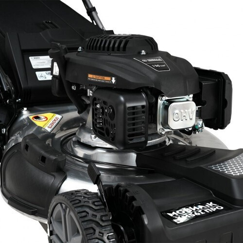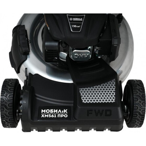 Бензиновая газонокосилка 3-в-1 с захватом 56 см ис приводом на передние колёса МОБИЛ К XM561 ПРО MBK0028142 разработана для обширных домовладений с площадью от 15 соток. Привод на передние колёса обеспечивает исключительную маневренность при работе между клумбами, кустарниками и деревьями. Особенности: - 3-в-1. Сбор травы в травосборник, мульчирование и боковой выброс. Газонокосилка может собирать траву в травосборник, возвращать ее на газон в виде мульчи, а также через боковой выброс. В комплект газонокосилки входит мульчирующая заглушка, встроенная в задний девлектор, обеспечивающая режим мульчирования и желоб бокового выброса. - Двигатель V200. На газонокосилку установлен мощный двигатель МОБИЛ К V200 с рабочим объемом 196 см. куб. с вертикальным расположением коленвала и верхним расположением клапанов (OHV). Двигатель имеет профессиональный бумажный воздушный фильтр для надежной защиты цилиндро-поршневой группы. - Трансмиссия FRONT WHEEL DRIVE. Ременный привод в сочетании с редуктором на передней оси и планетарными редукторами в ведущих колесах обеспечивают самоходную функцию. Вам не нужно толкать газонокосилку. Преимуществом газонокосилок с передним приводом является удобство маневрирования, когда для разворота косилки вам не нужно выключать привод. Просто надавите на ручку газонокосилки вниз, оторвав от земли переднюю ось с вращающимися колесами, разверните газонокосилку и двигайтесь в новом направлении. - Регулировка высоты скашивания EASY SET — это опция регулировки положения колёс двумя рычагами: одним - для колес передней оси и вторым - для колес задней оси. Опция позволяет перенастроить высоту скашивания в зависимости от потребности. Металлический привод обеспечивает четкость при переключении. Высота скашивания устанавливается в одном из 6 положений в диапазоне от 30 до 95 мм. - Эргономичная рукоятка SOFT GRIP. обеспечивает приятные ощущения и снижение вибрации. Оператор сам определяет какой рукой управлять газонокосилкой. - Тканевый травосборник. Благодаря своему легкому весу он практически не ощущается в руках оператора. Тканевый травосборник позволяет сложить его и уменьшить место для хранения и транспортировки. - Большие задние колеса обеспечивают легкость хода и повышенную проходимость на ровных участках. - Стальная дека, окрашенная в порошковой камере, будет надежно работать весь срок службы изделия. - Регулируемая ручка управления EASY HANDLE SETUP имеет регулировку по высоте с 3-мя положениями для операторов любого роста. - Штуцер для мойки деки. Для мойки нижней поверхности деки от травы подключите к штуцеру водопроводный шланг, включите воду и запустите двигатель на несколько минут. []Ширина 640 мм []Высота 430 мм []Глубина 960 мм []Вес 38 кг