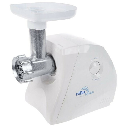 Электрическая мясорубка Ротор Альфа предназначена для приготовления мясного и рыбного фарша. Помимо этого на данной модели можно натереть, нашинковать или тонко нарезать овощи, фрукты и сыр. Тип мясорубки – шнековый, возможна комплектация разными насадками (приставка-мясорубка, приставка-овощерезка, насадка-соковыжималка). Корпус мясорубки и приемного лотка для продуктов изготовлены из прочного пластика белого цвета, на нижней части корпуса расположены прорезиненные ножки для дополнительной устойчивости.