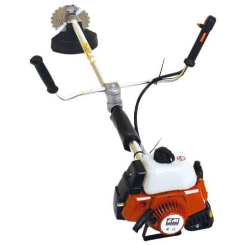 тип триммера: переносной мощность ДВС 2.7 л.с. двухтактный двигатель емкость топливного бака 0.8 л ширина скашивания 25 см режущий элемент триммера: леска и нож конструкция штанги: прямая форма рукояти: Т-образная (велосипедная) плечевой ремень наличие колес: нет