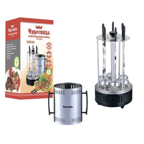 Электрошашлычница Чудесница ЭШ-1006 — это отличная возможность устроить пикник с шашлыками, не выходя из дома. Прибор поможет в приготовлении порционных кусочков мяса, птицы и сосисок, а также рыбы и морепродуктов, курицы, овощей и грибов. * В комплекте 6 шампуров длиной 31 см, каждый вмещает примерно 5-7 кусков. В процессе готовки они вращаются со скоростью 12 об/мин, что гарантирует равномерную прожарку. * Под каждым шампуром расположен поддон для сбора жира. * Кожух защищает окружающие предметы от попадания капель жира. * Нагревательный элемент изготовлен из керамики, расположен по центру. * Блюдо готовится в течение 15-20 минут.