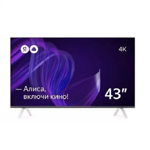 Телевизор Yandex с «Алисой» — 43-дюймовая модель с экраном разрешением 3840х2160 пикселей и технологий HDR 10, которая обеспечивает качественную и четкую картинку в наиболее светлых и темных зонах. Частота обновления достигает 60 Гц для плавной смены кадров в динамичных сценах. Формат экрана — 16:9. Яркость экрана достигает 300 кд/м², контрастность — 5000:1, время отклика пикселя — 9,5 мс. Углы обзора составляют 178° как по вертикали, так и по горизонтали. Цифровой тюнер принимает сигнал и обрабатывает его для вывода на экран. Есть возможность масштабирования контента в низком разрешении до 4K Ultra HD. В качестве операционной системы используется «Яндекс.ТВ»+Android 9.0. Мощность акустической системы составляет 16 Вт. Предусмотрен встроенный модуль Bluetooth. Для управления используется пульт ДУ, питающийся от двух батареек типа ААА. Поддержка Smart TV позволяет заниматься интернет-серфингом и смотреть интересующий видео-контент на онлайн-платформах (платных и бесплатных). Предусмотрена функция записи с ТВ на USB-устройство. Есть Sleep-таймер, позволяющий установить время отключения телевизора. Функция TimeShift дает возможность поставить телепрограмму на паузу и спустя некоторое время вернуться к ее просмотру, причем с того же самого места. Потребляемая мощность модели — 90 Вт. Набор интерфейсов состоит из трех HDMI версии 2.0, двух портов USB 2.0 тип A и оптического выхода Toslink. Настольная подставка входит в комплект. Есть возможность установки на стену с помощью крепления типа VESA 200x200.