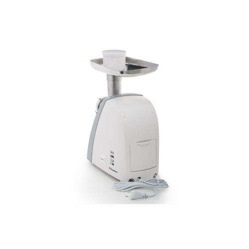 Мощная и функциональная мясорубка выполнена в бело-сером цвете, корпус сделан из качественного пластика, а лоток — из металла. На корпусе кнопка включения и кнопка блокировки двигателя. Для устойчивости в процессе работы на корпусе прорезиненная основа, мясорубка не скользит. Техника легко собирается, но отличается прочным креплением.
