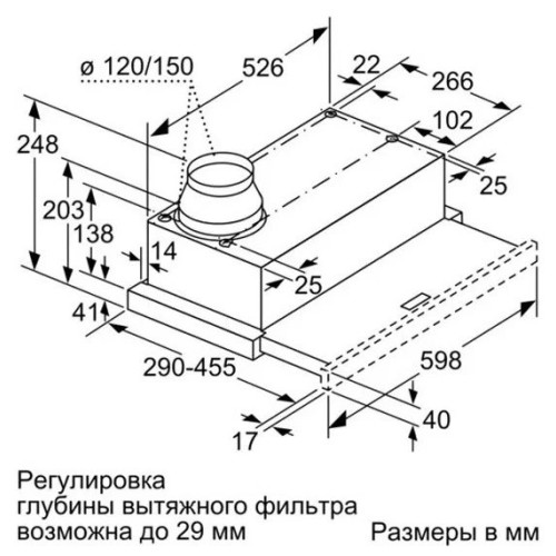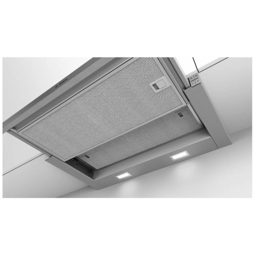 Встраиваемая вытяжка: едва заметная встроенная в нишу, обеспечивает элегантный дизайн кухни. Особенности: Тишина: максимальная производительность при минимальном шуме. EcoSilence Drive эффективный бесщеточный мотор. Интенсивный режим: быстрое и эффективное устранение кухонных запахов. Быстрая очистка воздуха на кухне благодаря высокой производительности. Металлический жироулавливающий фильтр- поглощает частички жира на кухне. Общие данные: Габариты: 24.8x59.8x29-45.5 см Максимальная производительность: 271 мsup3;/ч Освещение: светодиодное 2х1,5 Вт Уровень шума: 49/62 дБ Мощность подключения: 74 Вт Режимы работы: отвод /рециркуляция Управление: электронное Управление и функции: Управление с помощью клавиш 3 ступени мощности интенсивный режим Автоматическое отключение интенсивного режима можно выбрать в диапазоне 10 минут Дополнительная информация: Для монтажа в навесной шкаф шириной 60 см Цветовая температура освещения: 3500 К Освещенность до 294 люкс Пластина из перфорированной стали поверх жироулавливающего фильтра Металлический жироулавливающий фильтр пригодный для мытья в посудомоечной машине 1 - моторная конструкция Высокоэффективный мотор EcoSilenceDrive Штуцер для отвода воздуха empty; 120 мм / 150 мм Односторонний воздушный поток: предотвращает утечку воздуха внутрь, когда вытяжка не используется Электрический кабель длиной 1.75 м Для работы в режиме циркуляции требуется установка специального комплекта (дополнительная принадлежность)