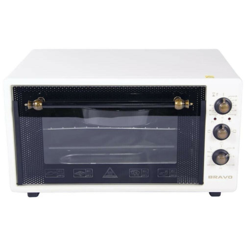 Электрическая мини-печь BRAVO отличается высоким качеством исполнения и стильным дизайном. Полезный объем духовки 38 литров. В комплект входит решетка , прямоугольный эмалированный противень с полезной для использования поверхностью 34 сантиметра по ширине и 30 сантиметров по длине , а также круглый эмалированный противень диаметром 37 сантиметров и глубиной 4,5 сантиметра. Устройство оснащено двумя мощными тэнами по 700 Ватт, диаметром поперечного сечения 1,1 сантиметра. На дверце из закаленного стекла изображены температура и время приготовления блюд из рыбы, мяса, овощей и теста. Электрический кабель на духовке с сечением провода 0,75мм длиной 108 сантиметров. В базовую комплектацию входит переключатель трёх режимов работы духовки ( только нижний тэн, только верхний тэн и одновременное включение), таймер на 90 минут и термостат с регулировкой температуры от 50 до 280 градусов цельсия. При включении нижнего тэна загорается правый световой индикатор, при включении верхнего левый. Одновременно световые индикаторы горят при включении режима работы двух тэнов. По окончании процесса приготовления звучит звуковой сигнал.