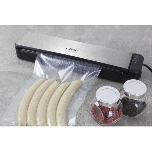 CASO VC 6 представляет собой автоматический вакуумный упаковщик. Он имеет крышку со вставкой из нержавеющей стали и отдельную кнопку запаивания. Устройство подходит для пакетов шириной 30 см, а также способен откачивать воздух из вакуумных контейнеров.