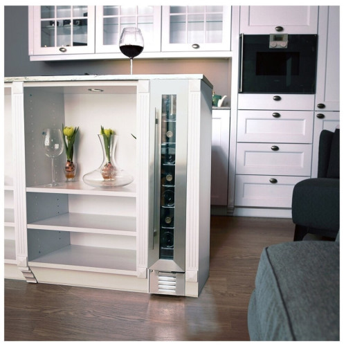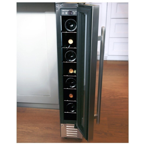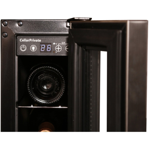 Встраиваемый шкаф Cellar Private CP007 – идеальное решение для среднестатистической семьи. Он вмещает в себя 7 бутылок, а этого вполне достаточно, чтобы время от времени проводить время за бокалом отменного вина. Шкаф можно поставить отдельно или встроить под столешницу, а затем выставить нужные параметры хранения при помощи сенсорной панели, которая располагается за дверцей. Подсвечиваясь мягким синим цветом, он будет сохранять вверенные ему бутылки. Бутылки в винном шкафу расположены очень компактно, друг над другом, на хромированных съемных полочках. Охлаждение происходит за счет компрессора, который способен поддерживать температуру от 5 до 20°С. При этом он очень тихий и совсем не создает вибраций. Прохладный воздух мягко циркулирует вокруг бутылок, обеспечивая нужные параметры. А вредные солнечные лучи не пропускаются двойными стеклами с тонировкой и УФ-фильтром.