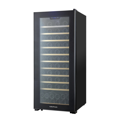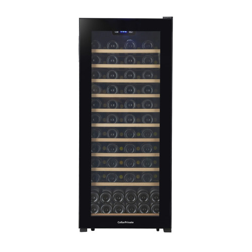 CellarPrivate CP102 это однозонный винный шкаф, вместимостью до 86 бутылок. Температура в камере 5-20°С Сенсорные кнопки управления температурой и подсветкой расположены на стеклянной дверце. Данная модель винного шкафа оснащена компрессорной системой охлаждения, за счет чего его можно использовать в достаточно теплом помещении, при этом, он будет стабильно держать заданную температуру. Постоянное проветривание бутылок обеспечивается бесшумными вентиляторами, установленными внутри камеры это предотвращает появление посторонних запахов и образование плесени. CellarPrivate CP102 оснащен 11 деревянными съёмными полками.