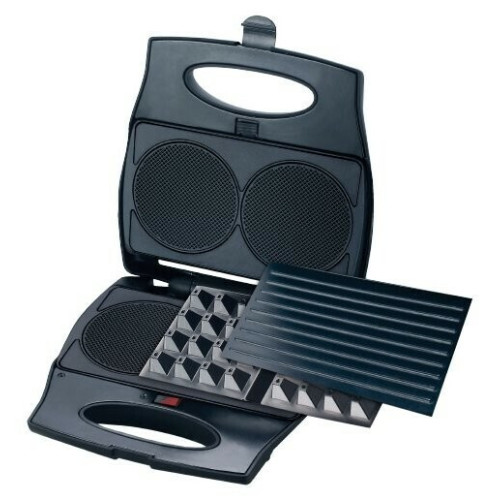 Вафельница Centek CT-1450 обладает мощностью 800 ватт и антипригарным покрытием, что в сочетании позволяет вам готовить венские или традиционные вафли каждый раз, когда этого захочется. Однако устройство обладает еще одним неоспоримым достоинством: на нем можно готовить не только десерты, но также поджаривать мясо или рыбу на гриле. Для этого устройство оснащено легкозаменяемыми формами для запекания. Корпус прибора выполнен из металла и пластика в черно-серебристой расцветке. Он оснащен теплоизолированными ручками, что не позволит обжечься во время работы. Готовность вафель и гриля в Centek CT-1450 определяется визуально.