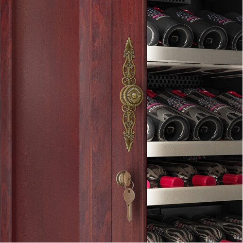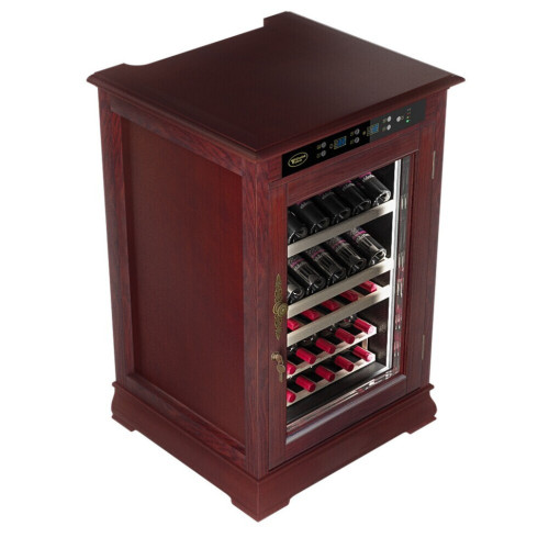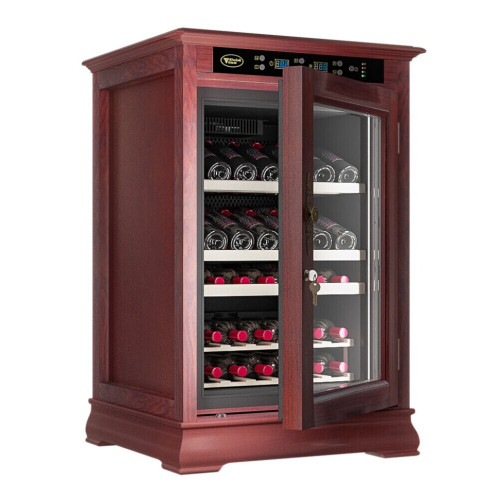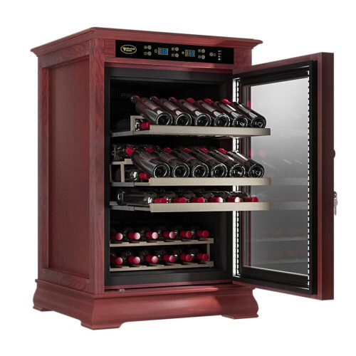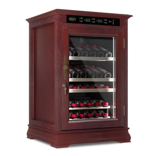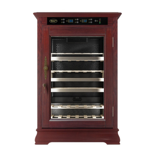 Классический винный шкаф Cold Vine C46-WM1 (Classic) является стильным дополнением к вашему дому и прекрасным помощником в вопросе хранения вина. Объем данного шкафа составляет 138 литров, а это означает, что вы с легкостью можете разместить внутри него до 46 бутылок вина типа Бордо объемом по 0, 75 литра. Данная модель является отдельностоящей, а это означает что у вас появится не просто многофункциональный помощник, но также и стильное дополнение к вашему интерьеру. Данный винный шкаф не подразумевает разделения на зоны, соответственно, вы можете разместить в нем вина только одного типа. Температурный режим может быть выставлен любой в диапазоне от +5 до +22 ˚С. Уникальная опция линейки данных шкафов - наличие цифрового контроля влажности. Тип охлаждения - компрессорный. Корпус данного винного шкафа выполнен из натурального дерева цвета махагон (американский дуб). В базовой комплектации имеются деревянные выкатные полки в количестве 4 штук. Встраивать компрессорный шкаф можно под столешницу с соблюдением зазоров не менее 5 см. Возможна установка на пол, как отдельностоящий. Нельзя устанавливать на тёплые полы или рядом с батареями.