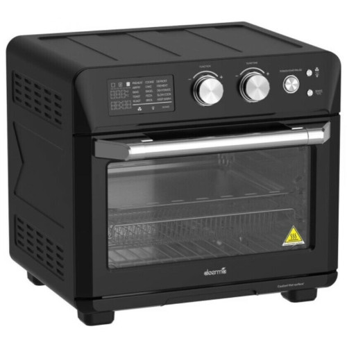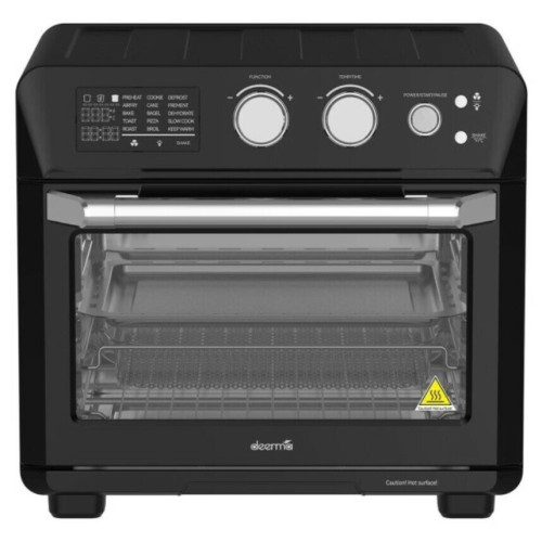 Мини-печь позволяет выпечь бисквит целиком для приготовления праздничного торта или сладкого десерта для семейного обеда. Мощность способствует разогреву камеры за короткий промежуток времени и сокращению времени приготовления блюда. Для управления устройством предусмотрены удобные механические переключатели. Металлическая дверца открывается вниз, предоставляя свободный доступ для извлечения горячего противня. Это снижает риск получения ожога. Мини-печь Deerma DEM-KZ115W в корпусе черного цвета обладает мощностью 1700 Вт. В прибор заложены 15 режимов, включая конвекцию, гриль и аэрогриль. Управление обеспечивают механические поворотные регуляторы и электронный программатор. Можно запрограммировать таймер со звуковым сигналом. Индикатор показывают заданную температуру, время до конца программы и выбранный режим. Корпус сделан из пластика и металла, дверца из термостойкого стекла. Термостат позволит контролировать температуру. Объем камеры — 24 л. Автоматические программы приготовления 15 шт: Preheat, Airfry, Roast, Toast, Bake, Pizza, Cake, Bagel, Broil, Cookie, Defrost, Trement, Dehydrate, Slow cook, Keep warm Устройство оснащено поддоном для крошек, в комплекте — плоский противень, ручка для его снятия и металлическая решетка. В приборе реализована функция напоминания о встряхивании. Размеры печи — 39,4х42,9х40,3 см, вес — 10,6 кг.