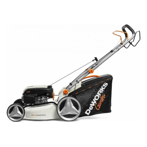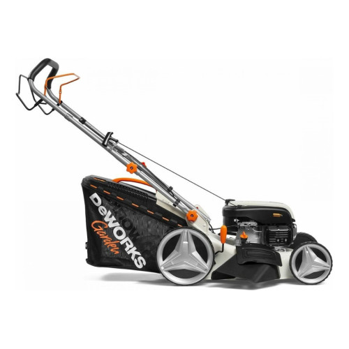 Бензиновая газонокосилка DeWorks L 50SP - агрегат для ухода за газоном на частном участке. Предусмотрена функция мульчирования, которая позволяет мелко измельчать скошенную траву и использовать её в качестве удобрения. Корпус из стали надежно защищает внутренние элементы агрегата от повреждений и внешних воздействий. Удобство использования. Травосборник объемом 65 л оснащен индикатором для удобства контроля за его заполнением. Преимущества DeWorks L 50SP: * Травосборник оснащен индикатором заполнения. * Самоходная модель. * Стальной корпус - высокая прочность. * Регулируемая высота кошения. * Предусмотрен дефлектор для бокового выброса травы. * Комплектуется двумя ножами для сбора травы и мульчирования. * Большой объем травосборника - продолжительная работа. * Турбо-нож позволяет собирать 100% скошенной травы в травосборник. * Отличается плавным ходом и маневренностью. * Оснащен функцией мульчирования. * Мульчирующий нож высокой прочности. * Высота скашивания удобно регулируется в 10 положениях при помощи рычага.